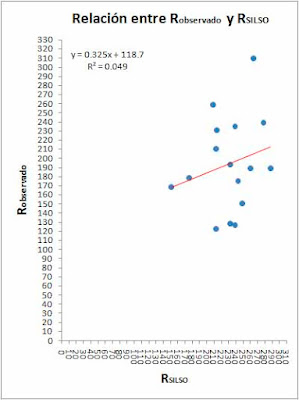 En esta gráfica se puede ver la correlación de los números de Wolf observados por mi y los calculados por el SIDC (SILSO). Así obtenemos la ecuación que relaciona ambos valores.
